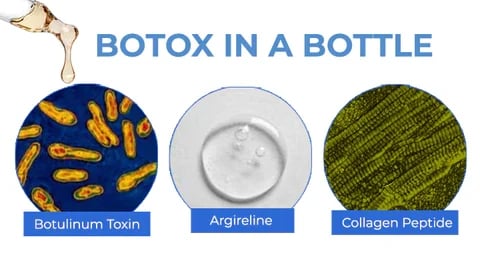 Infused with Botulinum toxin, a substance used in botox injections, this concentrated serum effectively eliminates facial fine lines and wrinkles. Botulinum toxin in cosmetic form reduces and fades forehead creases, frown lines, and crow's feet near the eyes.