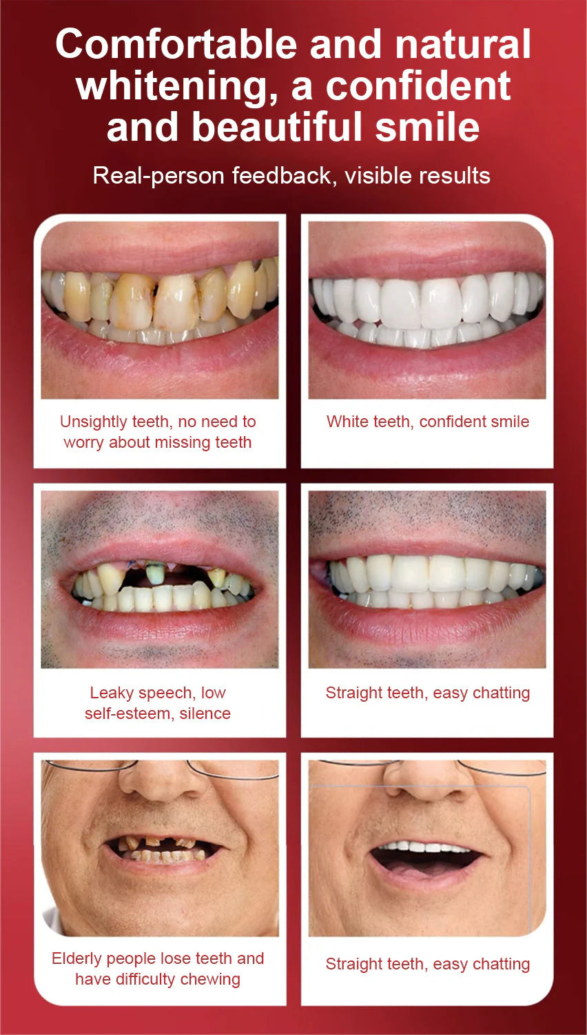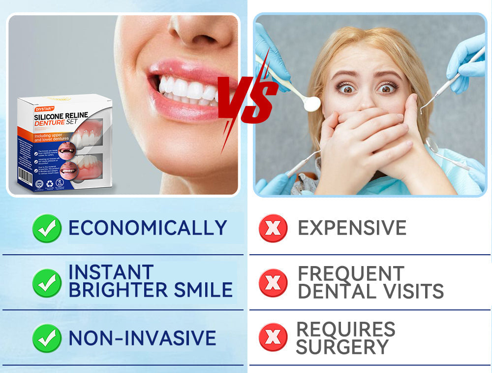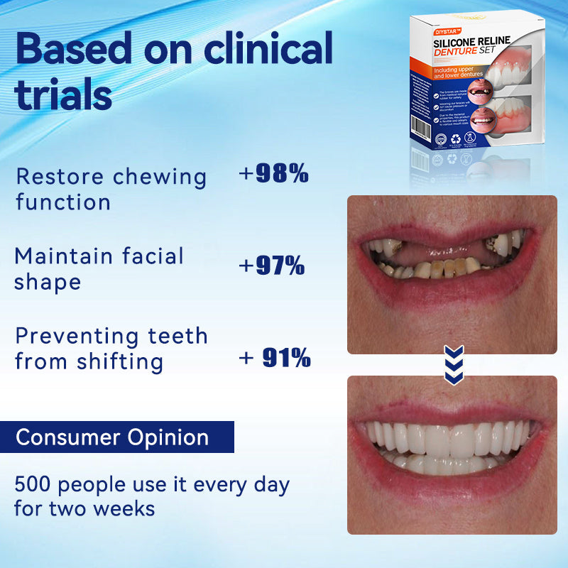 Do you sometimes feel insecure about your smile or crooked teeth? There's no need to go to the dentist for expensive treatment! The DIYSTAR™ Silicone Reline Denture Set offers a cost-effective solution to achieve a perfect smile.
