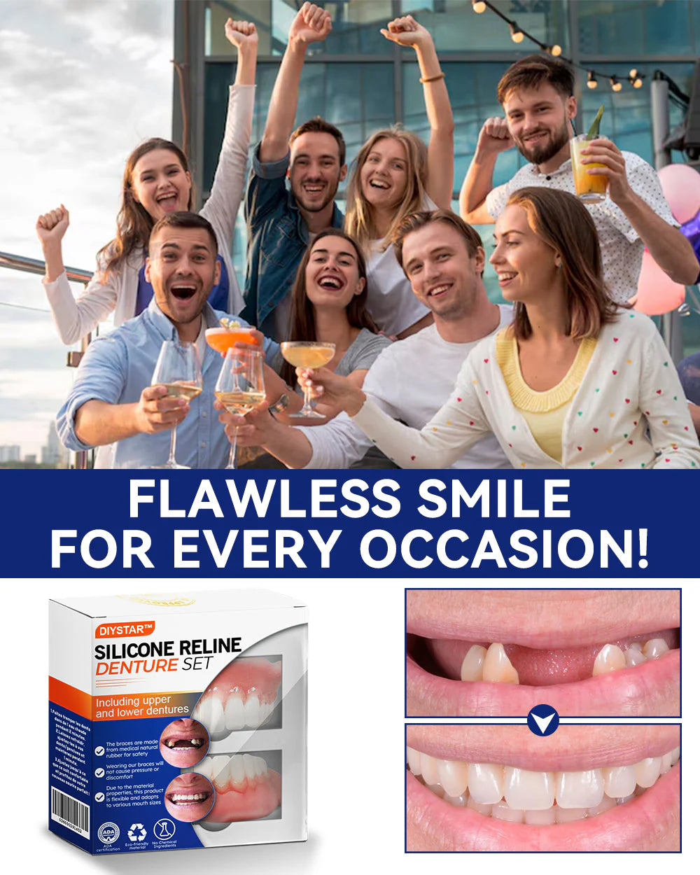 DIYSTAR™ is on a mission to change lives through innovative dental solutions that improve both your physical comfort and emotional well-being. Experience the freedom and confidence that so many others have already gained with the DIYSTAR™ Silicone Reline Denture Set. Join our growing community and discover how effortless it can be to enjoy a bright, confident smile every day!